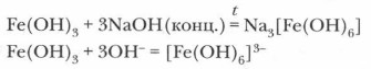 Гидроксид железа (II) не взаимодействует с растворами щелочей. Он представляет собой нерастворимое основание. Красно-бурый гидроксид железа (III) — еще более слабое основание. Он взаимодействует с кислотами и с концентрированными растворами щелочей, проявляя слабые амфотерные свойства и образуя комплексные соединения (гидроксокомплексы), аналогичные гидроксокомплексам алюминия: