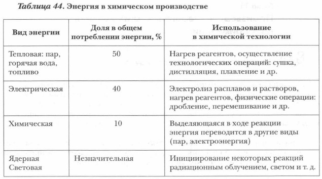 Большую часть неорганических веществ получают переработкой природного сырья: ископаемых минералов, озерных солевых растворов, воды, а также топлива и воздуха. Очень перспективным является использование в качестве сырья отходов различных производств, что дает возможность осуществлять безотходные технологии. Химические процессы протекают с выделением, с затратой или с взаимными превращениями энергии. В химической технологии энергия расходуется также на проведение вспомогательных операций, например на дробление, измерительные операции и др. (табл. 44).