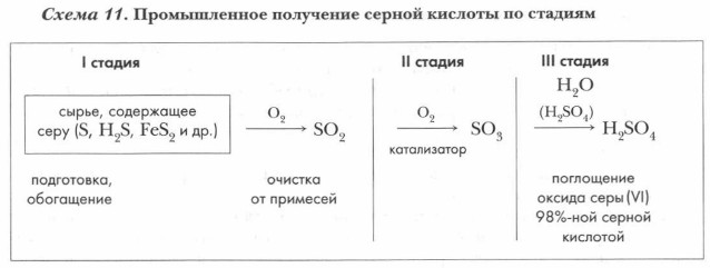 Серную кислоту можно получать различными способами. Химическая суть процессов состоит в окислении содержащего серу сырья до оксида серы (VI) и в переводе его в серную кислоту. Этот процесс состоит из нескольких стадий (схема 11).