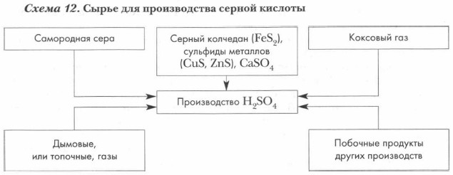 Серную кислоту можно получить из разнообразного сырья (схема 12). Каждый вид сырья имеет свои достоинства и недостатки. Однако до сих пор в качестве сырья в России используют преимущественно элементарную серу и серный колчедан. При этом доля использования колчедана уменьшается, а доля серы возрастает. Замена колчедана серой приводит к улучшению экологической обстановки в результате ликвидации отвалов огарка и уменьшения выбросов токсичных веществ в атмосферу. В последние годы все больше намечается тенденция комплексного использования сырья: например, используется оксид серы (IV), образующийся при обжиге сульфидов цветных металлов, и сероводород, выделяющийся при переработке различных веществ. Таким образом осуществляется принцип комбинирования различных производств (химических, металлургических, газоперерабатывающих и др.).