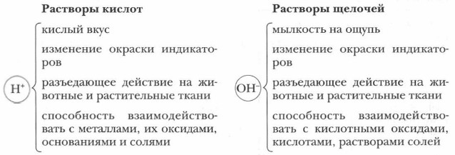Общие свойства некоторых классов неорганических соединений в ряде случаев обусловлены именно наличием в их растворах одинаковых ионов. Так, общие свойства растворов кислот связаны с содержанием в растворах ионов водорода (гидроксония) Н+, а общие свойства щелочей — наличием гидроксид-ионов ОН-. Сравним свойства растворов кислот и щелочей.