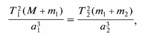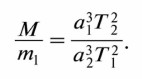 где М — масса Солнца; m1 — масса Земли; m2 — масса Луны; Т1 и a1 — период обращения Земли вокруг Солнца (год) и большая полуось её орбиты; Т2 и а2 — период обращения Луны вокруг Земли и большая полуось лунной орбиты. Пренебрегая массой Земли, которая ничтожно мала по сравнению с массой Солнца, и массой Луны, которая в 81 раз меньше массы Земли, получим: