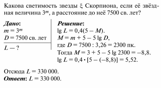1. Во сколько раз Сириус ярче, чем Альдебаран; Солнце ярче, чем Сириус? 2. Одна звезда ярче другой в 16 раз. Чему равна разность их звёздных величин? 3. Параллакс Веги 0,11". Сколько времени идёт свет от неё до Земли? 4. Сколько лет надо было бы лететь по направлению к созвездию Лиры со скоростью 30 км/с, чтобы Вега стала вдвое ближе? 5. Во сколько раз звезда 3,4 звёздной величины слабее, чем Сириус, имеющий звёздную величину —1,6? Чему равны абсолютные величины этих звезд, если расстояние до каждой составляет 3 пк?