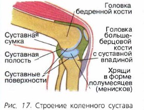 Соединения костейСоединения нужны либо для того, чтобы одни кости могли двигаться относительно других, либо для того, чтобы соединить несколько костей в одно прочное образование. Поэтому-то соединения костей и бывают различными: подвижными (прерывными), полуподвижными и неподвижными (непрерывными). 58 Подвижными соединениями являются суставы. Они бывают различной формы. Чаще всего сустав состоит из суставных поверхностей костей, покрытых гиалиновым хрящом, причём эти поверхности по форме строго соответствуют друг другу. Место контакта костей прикрыто прочной оболочкой из соединительной ткани — суставной сумкой, образующей герметичную суставную полость. В суставной полости находится особая жидкость, необходимая для уменьшения трения в суставе (рис. 17).