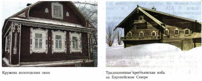 Природные условия Русского Севера наложили отпечаток на быт и образ жизни людей. Северные крестьянские избы совершенно не такие, как в более южных районах. Суровая зима требовала, чтобы все необходимое для жизни семьи находилось под одной крышей. Поэтому крестьянские дома Севера очень большие, обычно двухэтажные. Дом состоит из двух частей — жилой и хозяйственной, в которой находится скот, инвентарь и даже запасы сена на зиму. Снаружи дома часто украшались резьбой, затейливыми наличниками. В XIX в. городская архитектура тоже начала использовать такие приемы. Особенно известны городские дома Вологды, украшенные разнообразными узорами, что придает городу особый светлый облик. Долгий зимний период, свободный от сельскохозяйственных работ, позволял заниматься трудоемкими и многосложными видами художественных ремесел — серебряной филигранью, чеканкой, живописной эмалью и др. Прославилась Строгановская школа лицевого шитья (в Сольвычегодске) — «живопись шелком». Роль красок выполняли шелковые, серебряные или позолоченные нити (в виде тончайших проволочек или обвитые вокруг шелковой основы). Вышитые изображения персонажей Священной истории из мастерских Строгановых соперничали с изделиями из царских мастерских, а часто и превосходили их.