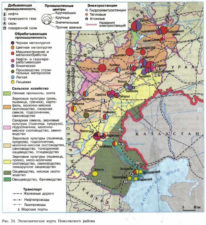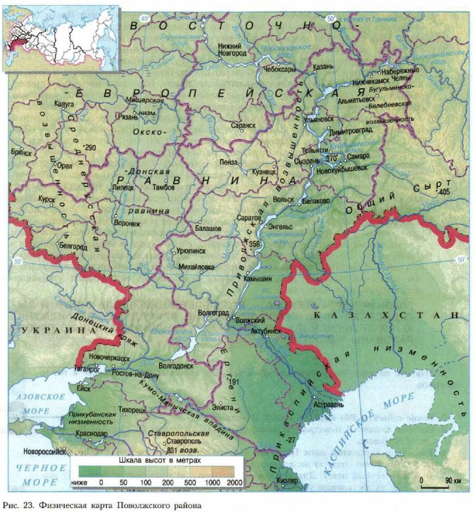 Географический регион, находящийся между Центральной Россией и Уралом, хорошо заметен на любой карте по своему четкому стержню — реке Волге. Традиционно к Поволжью относят территории вдоль среднего и нижнего течения реки. Это 2 республики — Татарстан и Калмыкия — и 6 областей: Ульяновская, Самарская, Пензенская (единственная, не выходящая к Волге), Саратовская, Волгогратская и Астраханская. Их центры (кроме Пензы) последовательно «нанизаны» на Волгу ниже Чебоксар: Казань, Ульяновск, Самара, Саратов, Волгоград. Астрахань. Читаем карту 1. Оцените географическое положение района. На карте (рис. 23) территория Поволжья выделяется своей формой, сильно вытянутой в меридиональном направлении вдоль главной оси — Волги. Обратите внимание, что через этот огромный перекресток в направлении восток—запад проходят крупные железнодорожные магистрали и трубопроводы, обеспечивая связи между Азиатской и Европейской Россией. Сама Волга, будучи крупнейшим водным путем в Единой глубоководной системе, обеспечивает связи в направлении север—юг (от Каспийского, Азовского, Черного морей до Балтийского и Белого). Волга и Кама с притоками — основа водных и гидроэнергетических ресурсов Поволжья. 2. Посмотрите па физическую карту. Поволжье лежит внутри континента: v дальше вглубь, тем холоднее зимы. Летом, напротив, все суше и жарче (вы помните, что сухость климата возрастает с северо-запада на юго-восток Русской равнины). Обратите внимание, что правый берег Волги — крутой, а левый — пологий. Приволжская возвышенность, протянувшаяся вдоль правого берега Волги (от Чебоксар до Волгограда), влияет на разницу в климатических условиях на двух берегах. Она, с одной стороны, задерживает западные ветры, и поэтому увеличиваются осадки, а с другой стороны, задерживает юго-восточные суховеи, и засухи на Правобережье не так часты, как на левом берегу, в Заволжье.