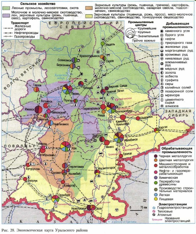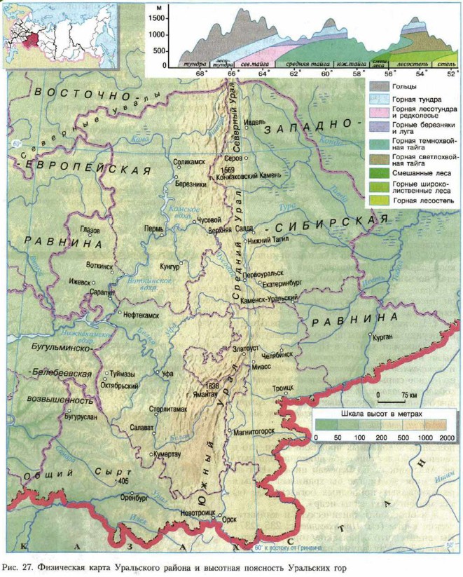 Урал § 36. Пространство УралаЧто мы знаем об УралеУральские горы — древние горы, протянувшиеся с севера на юг более чем на 2500 км. По Уралу проходит граница между частями света — Европой и Азией. Минеральное царство России. Урал — сокровищница самых разнообразных полезных ископаемых, но особенно он славится рудами различных металлов (железа, меди, никеля, цинка, алюминия, титана, магния, ванадия и многих других), месторождениями в осадочных породах (калийные соли, нефть, газ), а также самоцветами — драгоценными, полудрагоценными и поделочными камнями (изумруд, аметист, аквамарин, яшма, малахит и многие другие). Старейший промышленный район России — освоение природных богатств Урала и широкое заводское строительство началось с эпохи Петра I (XVII—XVIII вв.). П. П. Бажов — русский писатель, родившийся на Урале и создавший очерк «Уральские были», сказы «Малахитовая шкатулка» — главное произведение своей жизни. Д. Н. Мамин-Сибиряк — русский писатель, родившийся на Урале и воссоздавший в своих произведениях образы уратьской жизни и промышленного Урала XIX в. Башкирский мед — мед, который собирается в предгорьях Урала и считается одним из лучших по своим целебным качествам. Каслинское литье — художественные изделия (скульптура, садовые столики, решетки и т. д.) из чугуна, производящиеся на заводе в г. Касли. Кунгурская пещера — карстовая пещера на Среднем Урале, памятник природы. Протяженность 5,6 км, перепад высот 20 м. Состоит из многочисленных галерей и гротов. Крупнейший грот Геофафов имеет длину 155 м, ширину 32 м и около 60 озер с прозрачной водой. Ледяные образования — сталактиты и сталагмиты, кристаллы и наледи — создают причудливые формы. Ильменский заповедник — один из старейших в России. Создан в 1920 г. для охраны горных ландшафтов Южного Урала и исключительного минерального богатства недр. Какой общий вывод можно сделать, изучая карты Уральского района?Урал — это прежде всего Уральские горы, граница Европы и Азии. По площади территории Уральский район занимает пятое место в России (см. рис. 1). Это крупный экономически развитый район: добытчик, кузнец, бастион индустрии. В этих определениях отражено значение Урала для нашей страны. Известный геолог, академик Александр Евгеньевич Ферсман назвал Урал «жемчужиной минерального царства», считая его важнейшим мировым центром разнообразных полезных ископаемых. Читаем карту 1. По карте административно-территориального деления (см. Приложение, с. 228—229) вы можете познакомиться с субъектами, входящими в состав Урала: 2 республики (Башкортостан и Удмуртия), 1 край (Пермский), 4 обласобласти (Свердловская, Челябинская, Оренбургская, Курганская). 2. Сравнив карты на рисунке 27, в Приложении на с. 234, а также на с. 226— 227 (физическая карта России), вы увидите, что в состав традиционно выделяемого Уральского района Уральские горы входят не целиком, а лишь наиболее освоенной средней и южной частями. Таким образом, природные границы Урала не совпадают с экономическими.