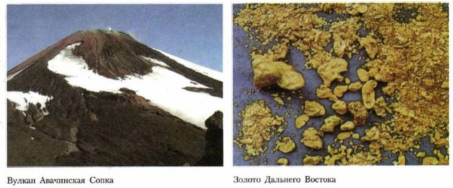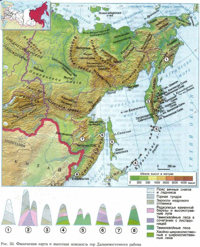 Азиатская Россия § 46. Пространство Дальнего ВостокаЧто мы знаем о Дальнем ВостокеЛососевые — здесь находятся основные российские ресурсы красной рыбы (горбуша, кета, нерка, семга, чавыча и др.). Икра лососевых рыб. Морепродукты — крабы, кальмары, мидии, трепанги, гребешки. Уссурийская тайга — природная сокровищница. Здесь встречаются северные и южные виды растений (ель и дикий виноград, сибирский кедр и субтропические лианы) и уникальные — женьшень, лимонник, амурский бархат, аралия и др. Амурский тигр — обитатель хвойно-широколиственных лесов Дальнего Востока, занесенный в Красную книгу России. На территории нашей страны сосредоточено 90 % общей популяции амурских тигров. Долина гейзеров (на Камчатке) — уникальный природный объект, где находится около 40 крупных и средних гейзеров и множество источников, периодически выбрасывающих фонтаны почти кипящей воды или горячего пара. Курило-Камчатский вулканический пояс — здесь насчитывается 68 действующих вулканов, или 12 % от общего числа действующих наземных вулканов. Самые крупные и мощные вулканы расположены на Камчатке. Ключевская Сопка — наиболее высокий (4688 м) и один из самых активных вулканов Евразии. Всемирное природное наследие — вулканы Камчатки, Центральный Сихотэ-Алинь, остров Врангеля. Какой общий вывод можно сделать, изучая карты Дальнего Востока?Дальний Восток в природном отношении совершенно другой район, чем Сибирь. Главная его отличительная особенность — неразрывная связь с Тихим океаном. Читаем карту 1. По карте (см. Приложение, с. 226—227) устанавливаем географическое положение района. Дальний Восток занимает восточную часть России и протягивается с севера на юг вдоль Тихого океана и его морей: Берингова, Охотского и Японского. На севере он омывается морями Северного Ледовитого океана — Лаптевых, Восточно-Сибирским и Чукотским.
