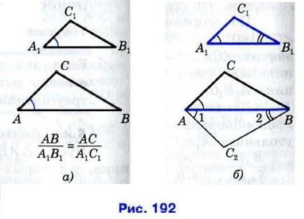 Доказательство Рассмотрим два треугольника АВС и А1В1С1, у которых Рассмотрим треугольник АВС2, у которого ∠1 = ∠A1, ∠2 = ∠B1 (рис. 192, б). Треугольники АВС2 и А1В1С1 подобны по первому признаку подобия треугольников, поэтому