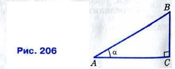 Синусом острого угла прямоугольного треугольника называется отношение противолежащего катета к гипотенузе. Косинусом острого угла прямоугольного треугольника называется отношение прилежащего катета к гипотенузе. Тангенсом острого угла прямоугольного треугольника называется отношение противолежащего катета к прилежащему катету. Синус, косинус и тангенс угла, равного а, обозначаются символами sin α, cos α и tg α (читается: «синус альфа», «косинус альфа» и «тангенс альфа»). На рисунке 206