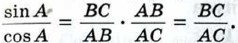 т. е. тангенс угла равен отношению синуса к косинусу этого угла. Докажем, что если острый угол одного прямоугольного треугольника равен острому углу другого прямоугольного треугольника, то синусы этих углов равны, косинусы этих углов равны и тангенсы этих углов равны. В самом деле, пусть АВС и А1В1С1 — два прямоугольных треугольника с прямыми углами С и С1 и равными острыми углами А и А1. Треугольники АВС и А1В1С1 подобны по первому признаку подобия треугольников, поэтому