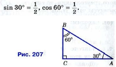 § 3. Применение подобия к доказательству теорем и решению задач Значения синуса, косинуса и тангенса для углов 30°, 45° и 60°Найдём сначала значения синуса, косинуса и тангенса для углов 30° и 60°. Для этого рассмотрим прямоугольный треугольник АВС с прямым углом С, у которого ∠A = 30°, ∠B = 60° (рис. 207). Так как катет, лежащий против угла в 30°, равен половине гипотенузы, то Но С другой стороны,