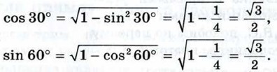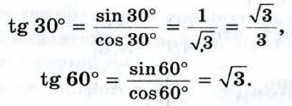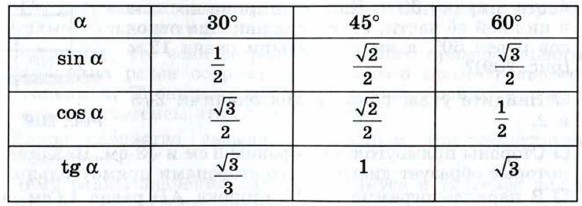 Составим таблицу значений sin α, cos α, tg α для углов α, равных 30°, 45°, 60°: