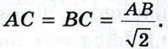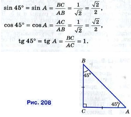 Найдём теперь sin 45°, cos 45° и tg 45°. Для этого рассмотрим равнобедренный прямоугольный треугольник АВС с прямым углом С (рис. 208). В этом треугольнике АС = ВС, ∠A = ∠B = 45°. По теореме Пифагора АВ2 = АС2 + ВС2 = 2АС2 = 2ВС2, откуда Следовательно,