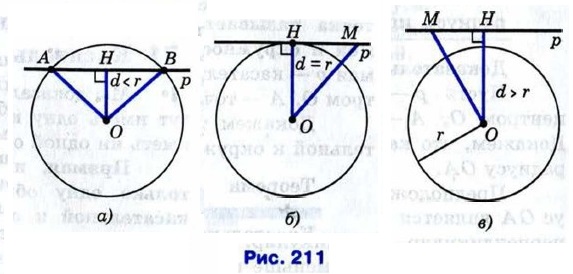 § 1. Касательная к окружности Взаимное расположение прямой и окружностиВ этой главе мы вернёмся к одной из основных геометрических фигур — к окружности. Будут доказаны различные теоремы, связанные с окружностями, в том числе теоремы об окружностях, вписанных в треугольник, четырёхугольник, и окружностях, описанных около этих фигур. Кроме того, будут доказаны три утверждения о замечательных точках треугольника — точке пересечения биссектрис треугольника, точке пересечения его высот и точке пересечения серединных перпендикуляров к сторонам треугольника. Первые два утверждения были сформулированы ещё в 7 классе, и вот теперь мы сможем провести их доказательства. Выясним, сколько общих точек могут иметь прямая и окружность в зависимости от их взаимного расположения. Ясно, что если прямая проходит через центр окружности, то она пересекает окружность в двух точках — концах диаметра, лежащего на этой прямой. Пусть прямая р не проходит через центр О окружности радиуса г. Проведём перпендикуляр ОН к прямой р и обозначим буквой d длину этого перпендикуляра, т. е. расстояние от центра данной окружности до прямой (рис. 211).