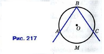 § 2. Центральные и вписанные углы Теорема о вписанном углеУгол, вершина которого лежит на окружности, а стороны пересекают, окружность, называется вписанным углом. На рисунке 217 угол АВС вписанный, дуга АМС расположена внутри этого угла. В таком случае говорят, что вписанный угол АВС опирается на дугу АМС. Докажем теорему о вписанном угле.