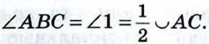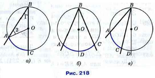 Отсюда следует, что 2∠1 = 2) Луч ВО делит угол АВС на два угла. В этом случае луч ВО пересекает дугу АС в некоторой точке D (рис. 218, б). Точка D разделяет дугу АС на две дуги:
