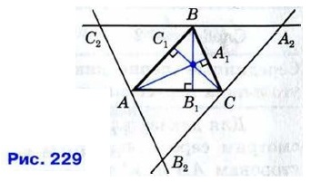 Доказательство Рассмотрим произвольный треугольник АВС и докажем, что прямые АА1 ВВ1 и СС1 содержащие его высоты, пересекаются в одной точке (рис. 229).