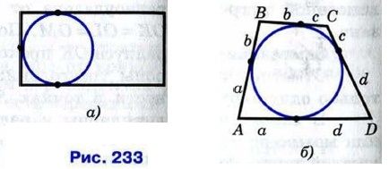 Замечание 3 В отличие от треугольника не во всякий четырёхугольник можно вписать окружность. Рассмотрим, например, прямоугольник, у которого смежные стороны не равны, т. е. прямоугольник, не являющийся квадратом. Ясно, что в такой прямоугольник можно «поместить» окружность, касающуюся трёх его сторон (рис. 233, а), но нельзя «поместить» окружность так, чтобы она касалась всех четырёх его сторон, т. е. нельзя вписать окружность. Если же в четырёхугольник можно вписать окружность, то его стороны обладают следующим замечательным свойством:
