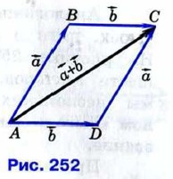 При доказательстве утверждения 10 мы обосновали так называемое правило параллелограмма сложения неколлинеарных векторов: чтобы сложить неколлинеарные векторы и , нужно отложить от какой-нибудь точки А векторы и построить параллелограмм ABCD (см. рис. 252). Тогда вектор равен Правило параллелограмма часто используется в физике, например при сложении двух сил.