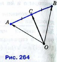 § 3. Умножение вектора на число. Применение векторов к решению задач Применение векторов к решению задачВекторы могут использоваться для решения геометрических задач и доказательства теорем. Приведём примеры. Рассмотрим сначала вспомогательную задачу. Задача 1 Точка С — середина отрезка АВ, а О — произвольная точка плоскости (рис. 264). Доказать, что