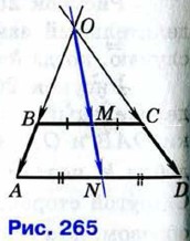 Задача 2 Доказать, что прямая, проведённая через середины оснований трапеции, проходит через точку пересечения продолжений боковых сторон. Решение Пусть ABCD — данная трапеция, М и N — середины оснований ВС и AD, а О — точка пересечения прямых АВ и CD (рис. 265). Докажем, что точка О лежит на прямой MN.