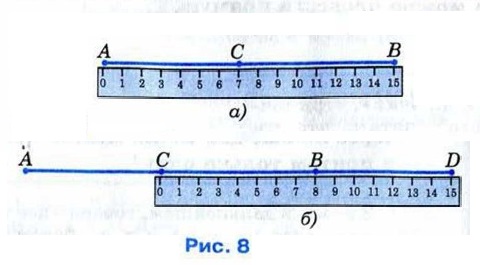 § 1. Прямая и отрезок Провешивание прямой на местности. ГеометрияРешим такую задачу: с помощью данной линейки построить отрезок более длинный, чем сама линейка. С этой целью приложим к листу бумаги линейку, отметим точки А и В и какую-нибудь точку С, лежащую между А к В (рис. 8, а). Затем передвинем линейку вправо так, чтобы её левый конец оказался около точки С, и отметим точку D около правого конца линейки (рис. 8, б). Точки А, В, С и D лежат на одной прямой. Если мы проведём теперь отрезок АВ, а затем отрезок BD, то получим отрезок AD, более длинный, чем линейка.