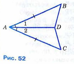 94. На рисунке 52 АВ = АС, ∠1 = ∠2. а) Докажите, что треугольники ABD и ACD равны; б) найдите BD и АВ, если АС = 15 см, DC - 5 см.