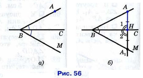 Доказательство Пусть А — точка, не лежащая на прямой ВС (рис. 56, а). Докажем сначала, что из точки А можно провести перпендикуляр к прямой ВС. Отложим от луча ВС угол МВС, равный углу АВС, как показано на рисунке 56, а. Так как углы АВС и МВС равны, то первый из них можно наложить на второй так, что стороны В А и ВС первого угла совместятся со сторонами ВМ и ВС второго угла. Наглядно это наложение можно представить себе как перегибание рисунка по прямой ВС. При этом точка А наложится на некоторую точку А1 луча ВМ (рис. 56, б). Обозначим буквой Н точку пересечения прямых AA1 и ВС. Отрезок АН и есть искомый перпендикуляр к прямой ВС. В самом деле, при указанном наложении (перегибании рисунка) луч НА совмещается с лучом НА1 поэтому угол 1 совмещается с углом 2. Следовательно, ∠1 = ∠2. Но углы 1 и 2 — смежные, значит, каждый из них прямой. Итак, АН ⊥ ВС.