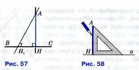 Докажем теперь, что из точки А можно провести только один перпендикуляр к прямой ВС. Если предположить, что через точку А можно провести ещё один перпендикуляр АН1 к прямой ВС, то получим, что две прямые АН и АН1, перпендикулярные к прямой ВС, пересекаются (рис. 57). Но в п. 12 было доказано, что это невозможно. Итак, из точки А можно провести только один перпендикуляр к прямой ВС. Теорема доказана.