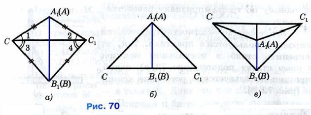 Возможны три случая: луч С1С проходит внутри угла А1С1В1 (рис. 70, а); луч С1С совпадает с одной из сторон этого угла (рис. 70, б); луч С1С проходит вне угла А1С1В1 (рис. 70, в). Рассмотрим первый случай (остальные случаи рассмотрите самостоятельно). Так как по условию теоремы стороны АС и А1С1, ВС и В1С1 равны, то треугольники А1С1С и В1С1С — равнобедренные (см. рис. 70, а). По теореме о свойстве углов равнобедренного треугольника ∠1 = ∠2, ∠3 = ∠4, поэтому ∠A1CB1 = ∠A1C1B1. Итак, АС = А1С1, ВС = В1С1, ∠C = ∠C1. Следовательно, треугольники АВС и А1В1С1 равны по первому признаку равенства треугольников. Теорема доказана.
