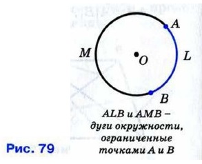 Любые две точки окружности делят её на две части. Каждая из этих частей называется дугой окружности. На рисунке 79 ALB и АМВ — дуги, ограниченные точками А и В.