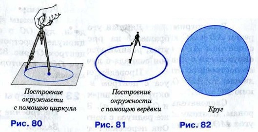Для изображения окружности на чертеже пользуются циркулем (рис. 80). Чтобы провести окружность на местности, можно воспользоваться верёвкой (рис. 81).