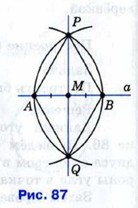 § 4. Задачи на построение Примеры задач на построение (окончание)Замечание Можно ли с помощью циркуля и линейки разделить данный угол на два равных угла? Ясно, что можно, — для этого нужно провести биссектрису этого угла. Данный угол можно разделить также на четыре равных угла. Для этого нужно разделить его пополам, а затем каждую половину разделить ещё раз пополам. А можно ли с помощью циркуля и линейки разделить данный угол на три равных угла? Эта задача, получившая название задачи о трисекции угла, в течение многих веков привлекала внимание математиков. Лишь в XIX веке было доказано, что для произвольного угла такое построение невозможно. Построение перпендикулярных прямыхЗадача Даны прямая и точка на ней. Построить прямую, проходящую через данную точку и перпендикулярную к данной прямой. Решение Данная прямая а и данная точка М, принадлежащая этой прямой, изображены на рисунке 87. На лучах прямой а, исходящих из точки М, отложим равные отрезки МА и МВ. Затем построим две окружности с центрами А и В радиуса АВ. Они пересекаются в двух точках: Р и Q.