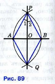 В самом деле, треугольники APQ и BPQ равны по трём сторонам, поэтому ∠1 =∠2 (рис. 89). Следовательно, отрезок РО — биссектриса равнобедренного треугольника АРВ, а значит, и медиана, т. е. точка О — середина отрезка АВ.