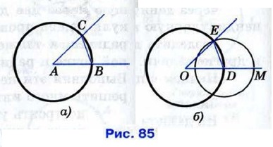 Проведём окружность произвольного радиуса с центром в вершине А данного угла. Эта окружность пересекает стороны угла в точках В и С (рис. 85, а). Затем проведём окружность того же радиуса с центром в начете данного луча ОМ. Она пересекает луч в точке D (рис. 85, б). После этого построим окружность с центром D, радиус которой равен ВС. Окружности с центрами О и D пересекаются в двух точках. Одну из этих точек обозначим буквой Е. Докажем, что угол МОЕ — искомый.