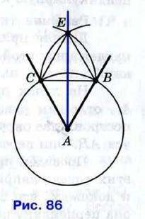 Рассмотрим треугольники АВС и ODE. Отрезки АВ и АС являются радиусами окружности с центром А, а отрезки OD и ОЕ — радиусами окружности с центром О (см. рис. 85, б). Так как по построению эти окружности имеют равные радиусы, то AB = OD, АС = ОЕ. Также по построению ВС = DE. Следовательно, То же построение можно выполнить и на местности, если вместо циркуля воспользоваться верёвкой. Построение биссектрисы углаЗадача Построить биссектрису данного угла. Решение Данный угол ВАС изображён на рисунке 86. Проведём окружность произвольного радиуса с центром в вершине А. Она пересечёт стороны угла в точках В и С.
