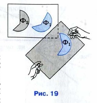 § 3. Сравнение отрезков и углов Равенство геометрических фигур. ГеометрияСреди окружающих нас предметов встречаются такие, которые имеют одинаковую форму и одинаковые размеры. Например, два одинаковых листа бумаги, две одинаковые книги, два одинаковых автомобиля. В геометрии две фигуры, имеющие одинаковую форму и одинаковые размеры, называют равными. На рисунке 19 изображены фигуры Ф1 и Ф2. Чтобы установить, равны они или нет, поступим так. Скопируем фигуру Ф1 на кальку. Передвигая кальку и накладывая её на фигуру Ф2 той или другой стороной, попытаемся совместить копию фигуры Ф1 с фигурой Ф2. Если они совместятся, то фигура Ф1 равна фигуре Ф2.