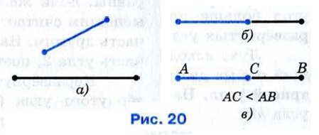 § 3. Сравнение отрезков и углов Сравнение отрезков и углов. ГеометрияНа рисунке 20, а изображены два отрезка. Чтобы установить, равны они или нет, наложим один отрезок на другой так, чтобы конец одного отрезка совместился с концом другого (рис. 20, б). Если при этом два других конца также совместятся, то отрезки полностью совместятся и, значит, они равны. Если же два других конца не совместятся, то меньшим считается тот отрезок, который составляет часть другого. На рисунке 20, в отрезок АС составляет часть отрезка АВ, поэтому отрезок АС меньше отрезка АВ (пишут так: АС < АВ).