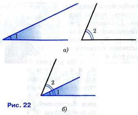 На рисунке 22, а изображены неразвёрнутые углы 1 и 2. Чтобы установить, равны они или нет, наложим один угол на другой так, чтобы сторона одного угла совместилась со стороной другого, а две другие оказались по одну сторону от совместившихся сторон (рис. 22, б).