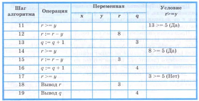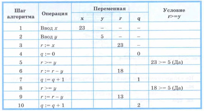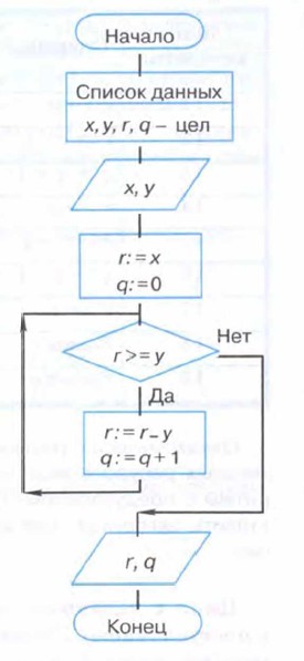 Представим операцию деления как последовательные вычитания делителя из делимого. Причём вычитать будем до тех пор, пока результат вычитания не станет меньше вычитаемого (делителя). В этом случае количество вычитаний будет равно частному от деления q, а последняя разность — остатку от деления r.