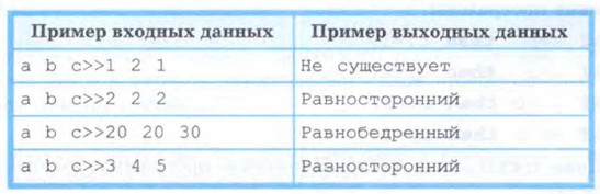 8. Даны три натуральных числа. Напишите программу, определяющую, существует ли треугольник с такими длинами сторо- н. Если такой треугольник существует, то определите его тип (равносторонний, равнобедренный, разносторонний).