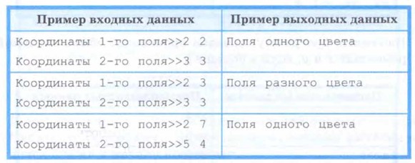 15. Поле шахматной доски определяется парой натуральных чисел, каждое из которых не превосходит 8. Напишите программу, которая по введённым координатам двух полей (k, l) и (m, n) определяет, являются ли эти поля полями одного цвета.