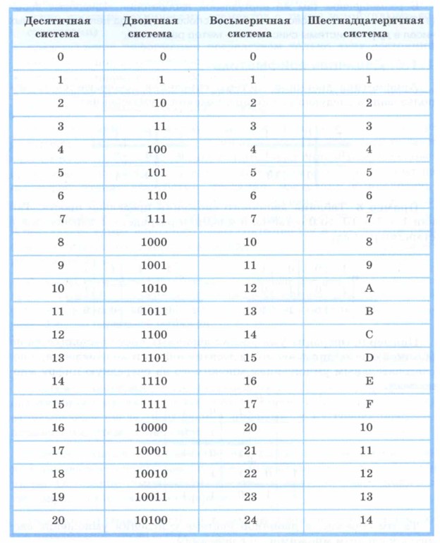 § 1.1. Системы счисления 1.1.5. Правило перевода целых десятичных чисел в систему счисления с основанием qДля перевода целого десятичного числа в систему счисления с основанием q следует: 1) последовательно выполнять деление данного числа и получаемых целых частных на основание новой системы счисления до тех пор, пока не получим частное, равное нулю; 2) полученные остатки, являющиеся цифрами числа в новой системе счисления, привести в соответствие с алфавитом новой системы счисления; 3) составить число в новой системе счисления, записывая его, начиная с последнего полученного остатка. Представим таблицу соответствия десятичных, двоичных, восьмеричных и шестнадцатеричных чисел от 0 до 2010.