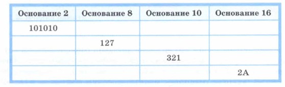 15. Заполните таблицу, в каждой строке которой одно и то же число должно быть записано в системах счисления с основаниями 2, 8, 10 и 16.