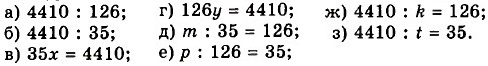 489. Решите задачу с помощью уравнения: а) Я задумал число. Если его разделить на 4, а потом от частного отнять 2, то получится 7. Какое число я задумал? б) 40 кг белил разлили в несколько банок, а потом в каждую банку добавили 2 кг красной краски. В каждой банке оказалось 7 кг краски. Сколько было банок? в) Для отправки детей в лагерь было заказано несколько автобусов. В них поровну рассадили 270 детей. Кроме детей в каждый автобус сели по двое взрослых. Сколько было автобусов, если в каждом находилось 47 пассажиров? 490. Зная, что произведение 126 и 35 равно 4410, выполните деление или решите уравнение: