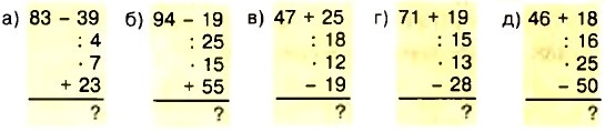 § 3. Умножение и деление натуральных чисел 12. Деление (продолжение)478. Составьте задачу с величинами «скорость», «время», «путь» по выражению: а) 150 : 5; б) 65 • 4; в) 900 : 150; г) 36 : 12. По тем же выражениям составьте задачу с величинами «стоимость товара», «цена», «количество товара». 479. Двое рабочих изготовили вместе 280 оконных рам. Один из них работал 14 дней по 7 ч в день, а другой — 7 дней по 6 ч. Сколько рам изготовил каждый из них, если они за 1 ч работы изготавливали одинаковое число рам? 480. На мельницу привезли 9600 кг пшеницы. При размоле отходы составили 1200 кг. Муку насыпали в мешки и погрузили на 3 машины. На первую погрузили 30 мешков, на вторую — 35 мешков, а на третью — 40 мешков. Сколько килограммов муки погрузили на первую машину, если во всех мешках муки было поровну? 481. Найдите значение выражения: