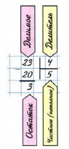 Число 23 здесь делимое, 4 — делитель, 5 — неполное частное и 3 — остаток.