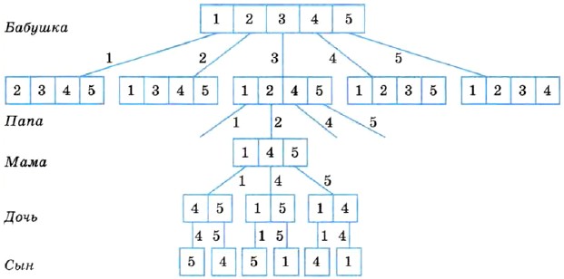 § 4. Площади и объёмы 17. Формулы. Математика 5 класс694. Семье, состоящей из бабушки, папы, мамы, дочери и сына, подарили 5 разных чашек. Сколькими способами можно разделить чашки между членами семьи? Р е ш е н и е. У первого члена семьи (например, бабушки) есть 5 вариантов выбора, у следующего (пусть это будет папа) остаётся 4 варианта выбора, следующий (например, мама) будет выбирать уже из 3 чашек, следующий — из двух, последний же получает одну оставшуюся чашку. Покажем эти способы на схеме.