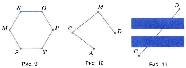 46. Отметьте в тетради точки М, А и К. Измерьте расстояния между точками М и А, А и К, К и М. Запишите результаты измерений. 47. Назовите вершины и стороны шестиугольника на рисунке 9. 48. Постройте в тетради пятиугольник ABCDE. Измерьте его стороны и запишите результаты измерений. 49. Какой отрезок надо провести на рисунке 10, чтобы получился четырёхугольник? Назовите вершины и стороны полученного четырёхугольника. 50. На рисунке 11 часть линии, соединяющей точки С и D, закрыта. Является ли эта линия отрезком? Проверьте с помощью линейки.